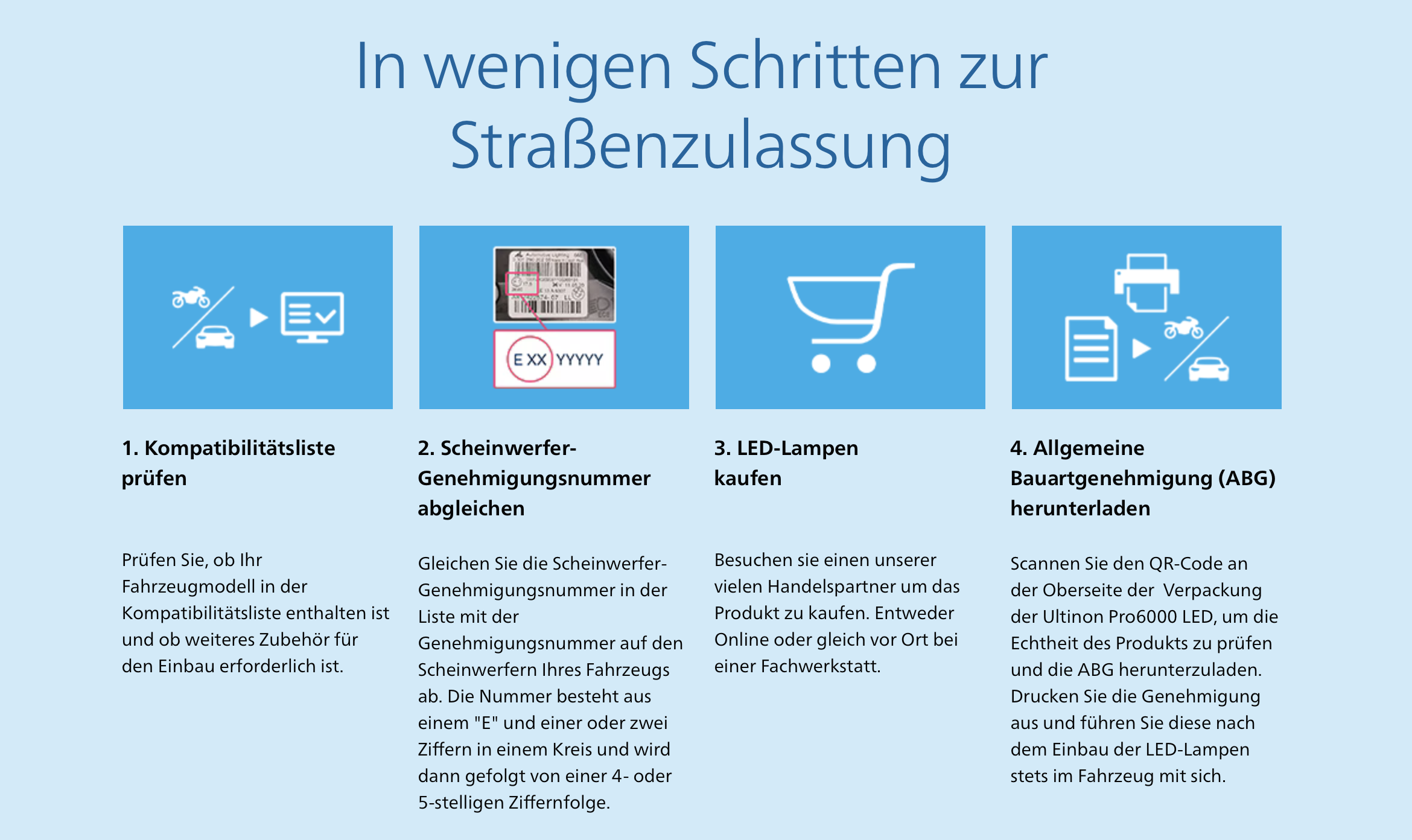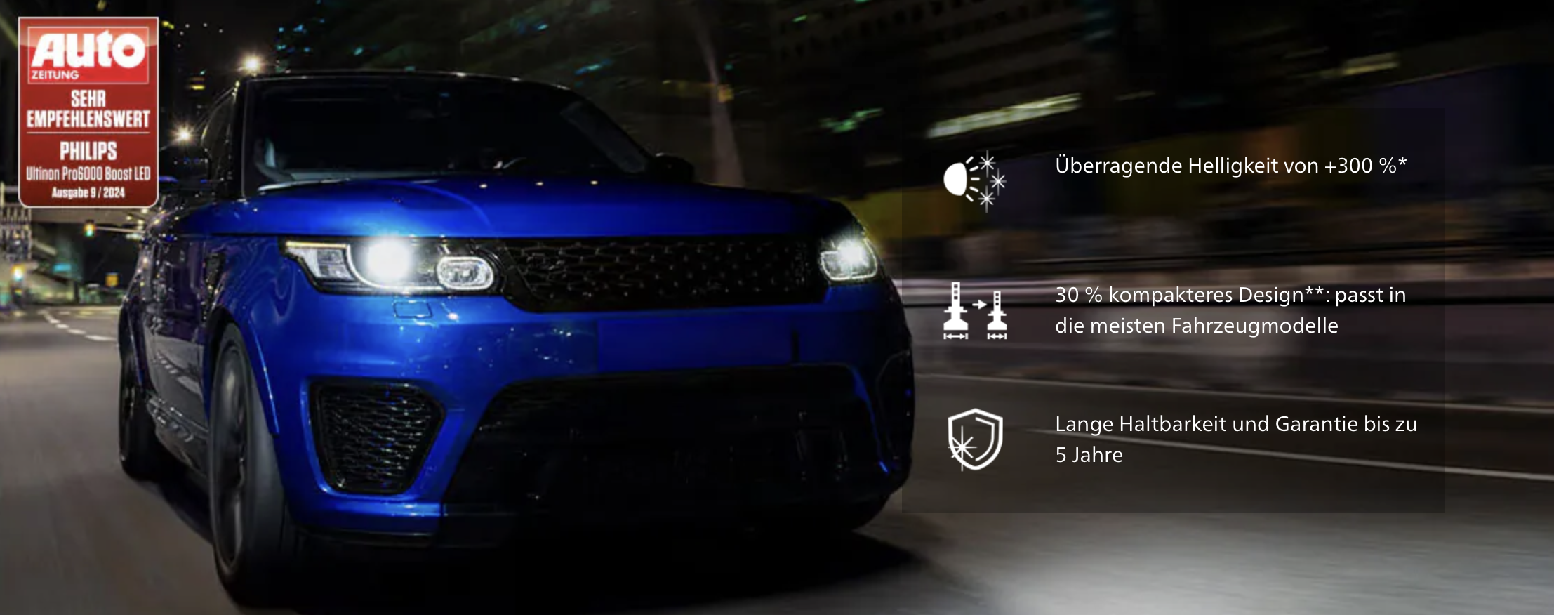 Die neue Philips Ultinon Pro6000 Boost H4 Ultimative Leistung für die StraßeEntdecken Sie die Philips Ultinon Pro6000 Boost Serie, den neuen Maßstab für LED-Lampen mit Straßenzulassung für Fahrzeuge. Entdecken Sie die nächste Generation der LED-Retrofit-Beleuchtung und erleben Sie eine neue Ära, in der Leistung und Lichtqualität neue Höhen erreichen. Von Automobilexperten anerkanntDie Philips Ultinon Pro6000 Boost-Serie ist in mehreren Ländern der Europäischen Union* für den Straßenverkehr zugelassen und entspricht damit den Straßenverkehrsvorschriften. Daher können die Philips Ultinon Pro6000 Boost LED-Lampen herkömmliche Lampen in einer Vielzahl von Kraftfahrzeugen – von Autos bis hin zu Zweirädern, Wohnmobilen, Transportern und Lkw – sicher ersetzen. Fahren Sie vertrauensvoll mit unseren neuen Philips Ultinon Pro6000 Boost LED-Lampen. Verbessertes Design für mehr KompatibilitätDie Philips Ultinon Pro6000 Boost H7-LED-Lampe ist um 30 % kleiner als sein Vorgängermodell und passt damit besser selbst in die schmalsten Scheinwerfer. Dieses ultrakompakte Design erleichtert den Lampenwechsel sowohl für das Fern- als auch für das Abblendlicht* und bietet Fahrern mehr Vielseitigkeit und Funktionalität. Sehen Sie sich unsere Philips Ultinon Pro6000 Boost Kompatibilitätsliste unter Philips.com/roadlegalLED an und holen Sie sich den besten LED-Ersatz für Ihre Halogenlampen! Bis zu 300 % mehr Helligkeit auf der Straße!Jetzt können Sie mehr Helligkeit bei gleicher Lichtleistung erzielen. Die Philips Ultinon Pro6000 Boost-Reihe verfügt über die in der Automobilindustrie exklusive Altilon TopContact LED, kombiniert mit einer revolutionären Architektur, die eine einzigartige optische Leistung garantiert. Das Ergebnis ist eine beeindruckende Steigerung der Helligkeit auf der Straße – bis zu 300 % mehr!** Rüsten Sie Ihre Scheinwerfer mit unseren Philips Ultinon Pro6000 Boost-Lampen auf und erreichen Sie so ein Höchstmaß an LED-Leistung für Ihr Fahrzeug. Hochwertiges Licht verbessert die Sicht auf die StraßePhilips Ultinon Pro6000 Boost bietet einen brillanten weißen Lichtstrahl, der durch eine einzigartige Farbtemperatur von 5.800 Kelvin erreicht wird. Das optimale Spektrum verbessert die Sichtbarkeit von Verkehrsschildern und macht sie für den Fahrer leichter erkennbar. Philips Ultinon Pro6000 Boost-Lampen sind außerdem mit unserer hochmodernen SafeBeam-Technologie ausgestattet, die einen blendfreien Lichtstrahl erzeugt, der entgegenkommende Fahrer nicht blendet. Mit den Philips Ultinon Pro6000 Boost-Lampen genießen Sie eine klarere Sicht durch außergewöhnliche Beleuchtung. Langfristige Haltbarkeit und GarantieDie Philips Ultinon Pro6000 Boost-Serie verfügt über die fortschrittliche AirBoost-Kühltechnologie, die die Wärmeableitung verbessert und eine Lebensdauer der LED-Lampen von bis zu 3.000 Stunden ermöglicht. Ihre einzigartige Konstruktion bietet eine konstante, zuverlässige Leistung und eine sechsmal längere Lebensdauer als vergleichbare Halogenlampen. Mit der Philips Ultinon Pro6000 Boost-Reihe erhalten Sie eine umfassende Gewährleistung von 5 Jahren, einschließlich einer 2-jährigen Standardgewährleistung und einer zusätzlichen 3-jährigen erweiterten Gewährleistung***. Profitieren Sie jetzt von allen Vorteilen eines verbesserten Lichts und der Sicherheit einer lang anhaltenden Leistung. Vertrauen Sie auf das Philips Know-howMit unserer umfangreichen Expertise in der Herstellung von Premium-Fahrzeugbeleuchtungsprodukten, bei denen Sicherheit und Zuverlässigkeit an erster Stelle stehen, sind wir Spitzenreiter, wenn es um die Einhaltung höchster Qualitätsstandards geht. Unsere Produktreihe von LED-Lampen von Philips erfüllt die strengen Anforderungen an die elektromagnetische Verträglichkeit (EMI) mit Fahrzeugsystemen und bieten eine stabile Beleuchtung von professioneller Qualität. Leidenschaft trifft Innovation:• Bis zu 300%helleres Licht*• Weißes LED-Licht mit 5800K• Bis zu 3000h Lebensdauer – 6 mal länger als Halogen!• 12V - und erstmals auch 24V-Kompatibilität• Bis zu 5 Jahre Garantie***• H7 besitzt neues, einzigartig kompaktes Design durch die über 20 bisher nicht erreichbare Fahrzeugmodelle möglich werden, ohne zuzätzliche Abdeckkappen!• Kompatibel mit existierendem Zubehör (Adapter-Ringe und CANBus)* Die Philips Ultinon Pro6000 LED Boost-Serie ist nur für den Straßenverkehr und für die aufgeführten Fahrzeugmodelle und Beleuchtungsfunktionen in Ländern zugelassen, in denen eine Genehmigung besteht. Weitere Informationen über die in Ihrem Land geltenden gesetzlichen Bestimmungen und unsere aktuelle Kompatibilitätsliste finden Sie unter Allgemeine Betriebserlaubnis https://www.philips.com/roadlegalLED . Sie sind dafür verantwortlich, die in Ihrem Land geltenden gesetzlichen Anforderungen einzuhalten.** Im Vergleich zum gesetzlichen Standard für Halogenlampen*** Die Philips Ultinon Pro6000 LED Boost-Serie ist durch eine 2-jährige Garantie beim Kauf und eine kostenlose 3-jährige erweiterte Garantie bei der Registrierung abgedeckt. Weitere Informationen zu unseren Garantierichtlinien, finden Sie unter Garantiebedingungen https://www.philips.com/auto-warranty . Die Garantie von Philips gilt nur für Herstellungsfehler und den nicht-kommerzielle Gebrauch. Rechtlicher Hinweis: Sie selbst sind für die Einhaltung aller geltenden gesetzlichen Vorschriften verantwortlich. Philips Ultinon Pro6000 LED ist für den Straßenverkehr nur für ausgewählte Fahrzeugmodelle und Lichtfunktionen zugelassen. Bitte laden Sie das Zulassungsdokument, die Allgemeine Bauartgenehmigung (ABG), herunter und führen Sie dieses in Ihrem Fahrzeug mit sich. Zugelassene Fahrzeugmodelle und weitere Informationen über die Zulassung in Ihrem Land unter philips.com/roadlegalled
