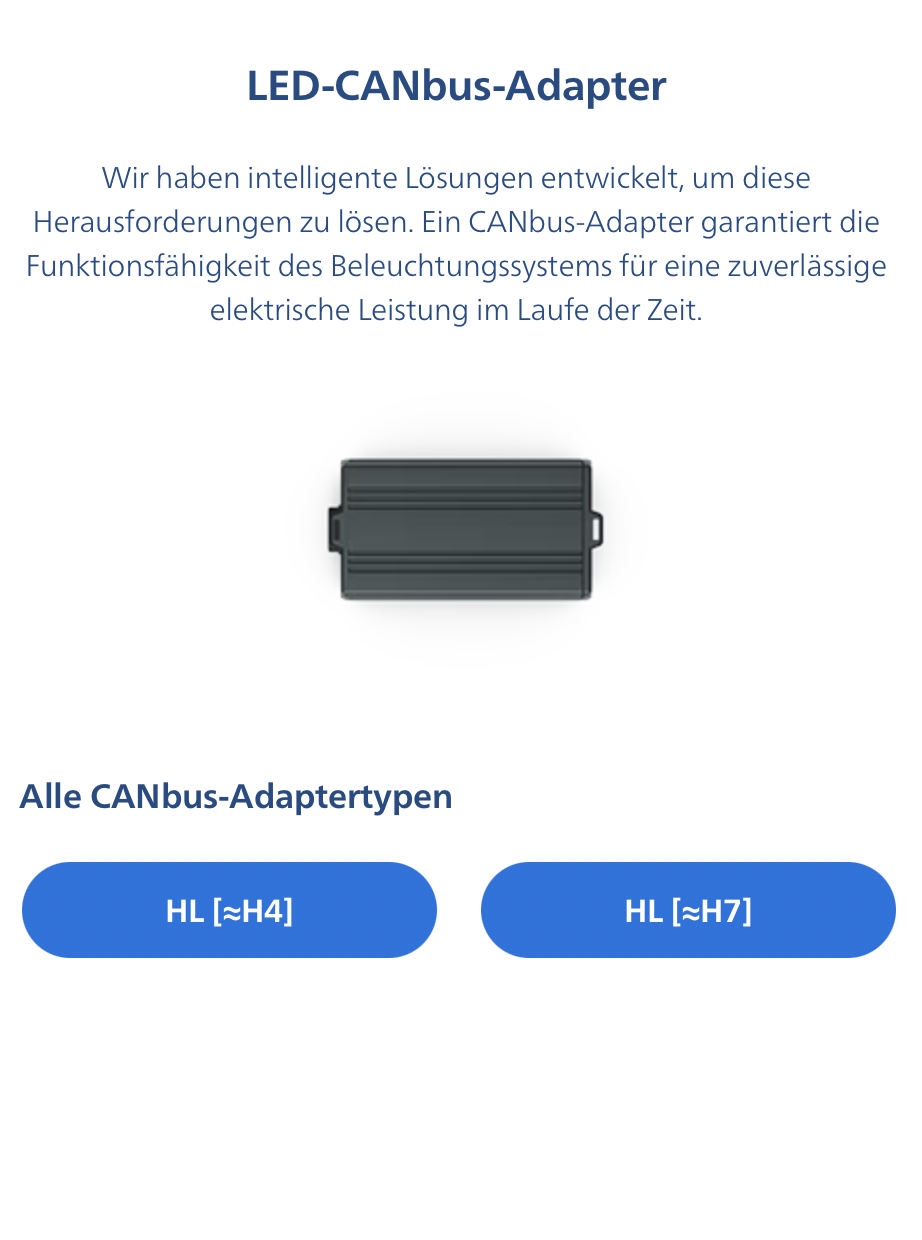 3-in-1-Lösung Erweitertes Fahrzeugsystem Für [≈ H4]-LED-Nachrüstlampen Anzeigen- und Lichtfehler vermeiden Einfache Installation Wasserdichtes Design Irreführende Armaturenbrettanzeigen vermeidenManchmal wird beim Einbau von LED-Nachrüstlampen der geringere Stromverbrauch der LED vom Fahrzeugsicherheitssystem als Ausfall der Lampen interpretiert. Dies führt zu einer Fehleranzeige auf dem Armaturenbrett, obwohl die LED-Lampen einwandfrei funktionieren. Um diese Unannehmlichkeiten zu vermeiden, empfehlen wir die Verwendung eines Philips CANbus-Adapters. Der Philips CANbus-Adapter für Philips LED HL [H4]-Lampen wird an das im Fahrzeug verbaute Sicherheitssystem angeschlossen, um falsche Fehleranzeigen auf dem Armaturenbrett zu vermeiden. So können Fahrer und Fahrerinnen ihre Philips LED-Lampen sorgenfrei verwenden. Flackern und Dimmungsproblemen vorbeugenDer geringere Stromverbrauch von LED-Lampen kann manchmal zu Stromvariationen führen, was zu einer Herabstufung der Leistung der LED-Scheinwerferlampen führt. Mit einer intelligenten 3-in-1-Funktion bietet unser Philips CANbus-Adapter eine zusätzliche Kondensatorfunktion, wodurch Flackern und Dimmungsprobleme vermieden werden. Mit den neuesten Philips CANbus-Adaptern holen Sie das das Optimum aus Ihren Philips LED-Nachrüstlampen heraus. Eine Entscheidung für SorgenfreiheitJedes Fahrzeugmodell ist anders; die meisten benötigen keinen Philips CANbus-Adapter, wenn sie LED-Leuchten nachrüsten! Wenn Sie wissen möchten, ob für Ihr Fahrzeugmodell ein Philips CANbus-Adapter erforderlich ist, besuchen Sie unsere Philips Website und schauen Sie in die aktuelle Online-Kompatibilitätsliste**.